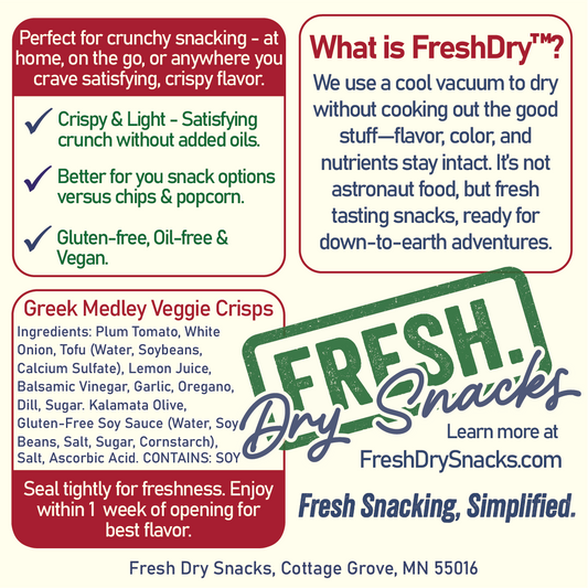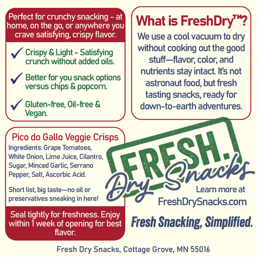 Our snacks aren’t freeze-dried or pumped with preservatives. We use a gentle Fresh-Dry™ process that keeps the real nutrients and flavor of raw produce intact. That means bold taste, powerful crunch, and fresh ingredients you can feel good about.