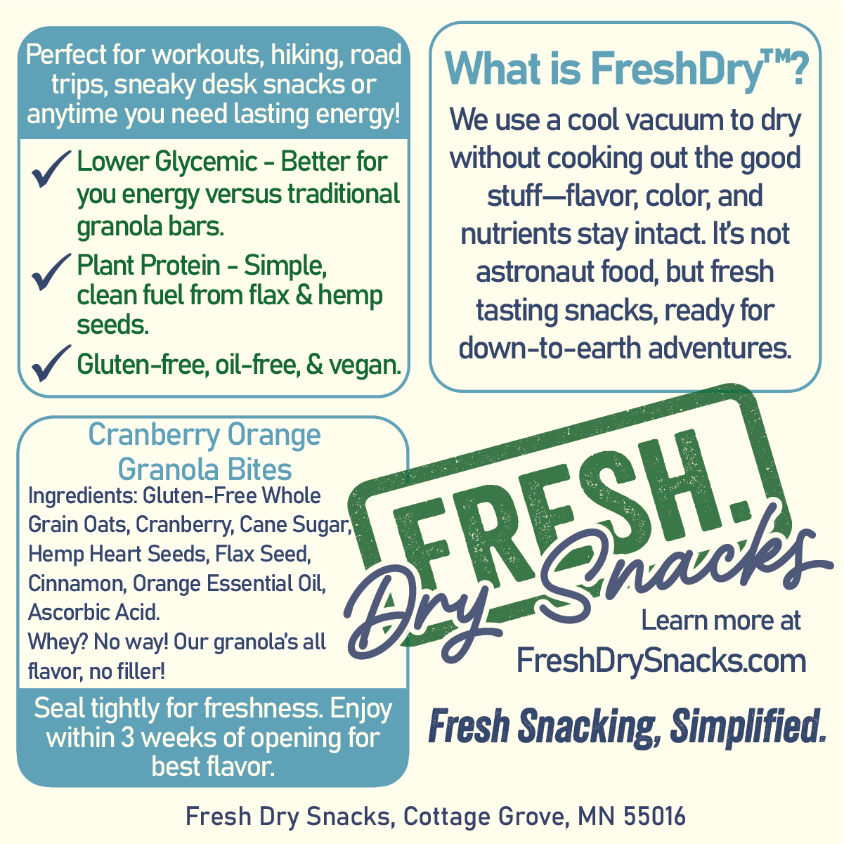 Our Granola Bites are a great way to keep a healthy, filling snack on hand wherever you need to go! They are gluten-free oat based with hemp hearts and flaxseed added for extra protein and fiber. We use cane sugar instead of white sugar as it has a lower glycemic level and won't spike your blood sugars in the same way. They are lightweight from the Fresh Dry(TM) process and are a great addition to your camping or backpacking supplies. We only have cranberries seasonally, so make sure you stock up while you can!!